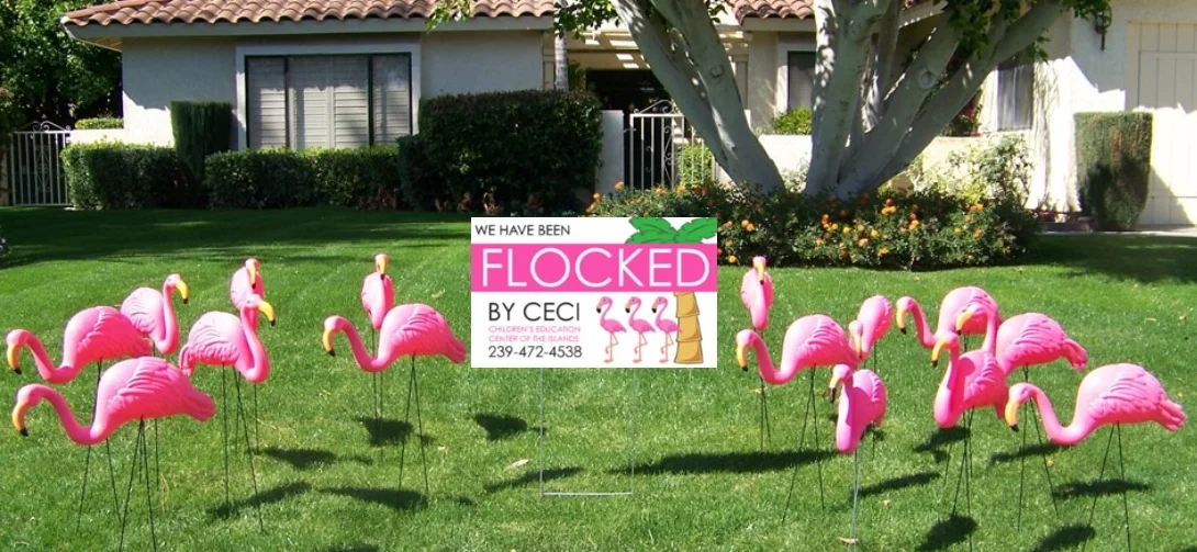 Several flocks of flamingos have been spotted in people's yards around the islands of Sanibel and Captiva. While these beautiful, pink flamingos may seem harmless, they are actually very territorial and capable of creating great conversation, laughter and even in some cases, good hearted revenge! In case you did not know, unless they are placed on someone else's lawn, they will roost on your property for a very long time! Removal of the flock of pink, plastic flamingos should be attempted only by trained professionals. The Children's Education Center of the Islands has specially trained Removal Technicians that you can call and who will remove the flock without harming them, for a small donation.